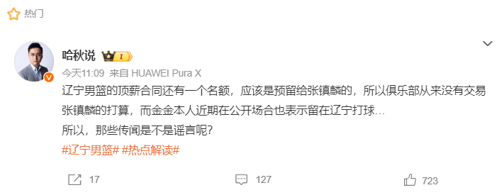 辽宁男篮多位媒体人都已经发声回怼,比如哈秋说:辽宁男篮还留了一个顶薪名额,应该就是给张镇麟留的,俱乐部从来没有交易张镇麟的打算。近期,张镇麟本人也在公开场合表示想要留在辽宁打球,所以,那些传闻是不是谣言?